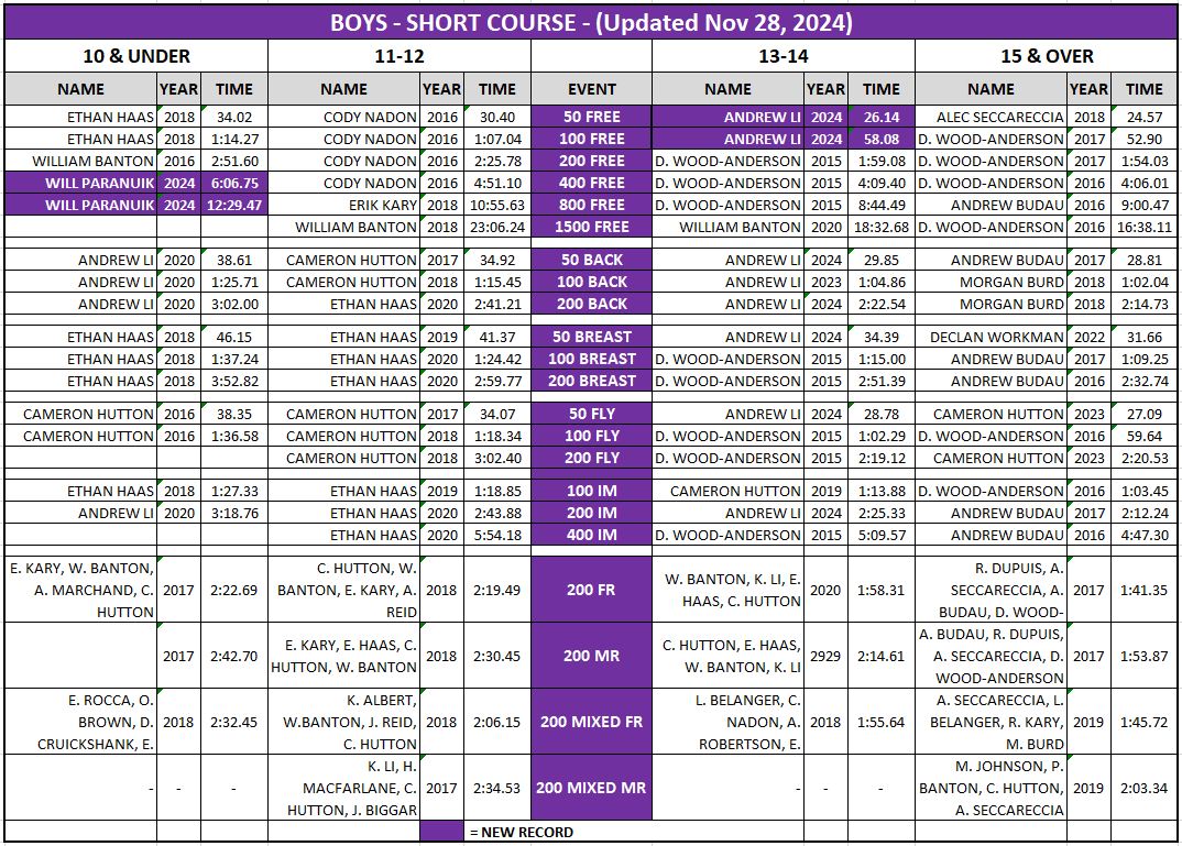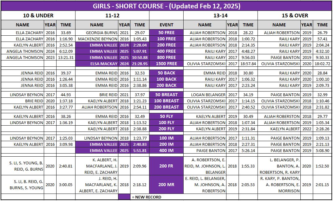 | NOTE: SSAT's SwimRankings records do NOT include certain competitions that swimmers can take part in, such as Team Ontario and Team Canada in Canadian and International events. Results at meets held in 25 yard pools and age-group relays also do not appear on SwimRankings. SSAT also maintains PDF versions of our Club Records which is the printed version for the John Rhodes Lobby display. This includes listings for top relay times. The PDFs are updated at the end of each season. |