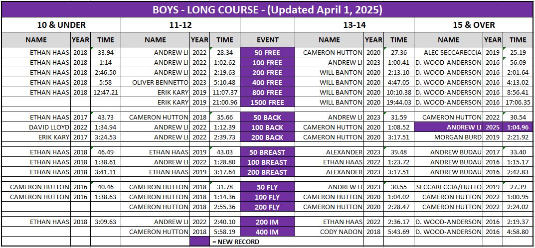 | Everyone at Sault Surge Aquatic Team is proud of the daily effort of all our athletes. Many of our swimmers are fortunate enough to have achieved SSAT record times. Our SSAT Club Records Board will be maintained in the in the John Rhodes Pool Lobby, updated yearly. SSAT's all-time top times for short course (SCM) and long course (LCM) events can also be found online at SwimRankings.net |