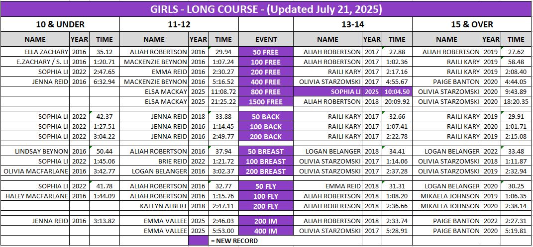 | NOTE: SSAT's SwimRankings records do NOT include certain competitions that swimmers can take part in, such as Team Ontario and Team Canada in Canadian and International events. Results at meets held in 25 yard pools and age-group relays also do not appear on SwimRankings. |